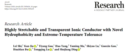 该工作以题目为“Highly Stretchable and Transparent Ionic Conductor with Novel Hydrophobicity and Extreme Temperature Tolerance”发表在《Research》上。《Research》是由中国科协与美国科学促进会合办的国际化高水平综合性大型科技期刊,是《Science》自1880年创建以来第一本对外合作的期刊,主要报道国内外科学家在人工智能与信息科学、生物学与生命科学、能源研究、环境科学、新兴材料研究、机械科学与工程、微纳米科学、机器人与先进制造、技术研究和应用9个交叉学科领域的最新高水平突破性原创科研成果,以及在解决重大科学问题、建设重大科学工程中所取得成就的系列学术文章。