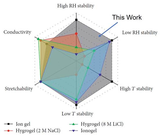离子凝胶可以克服水凝胶的这些不足,具有极低蒸气压,宽的工作温度范围和宽的电化学窗口等独特优势。但是,大多数现有的离子凝胶也对湿度敏感,因为离子液体容易吸收空气中的水分,尤其是在高湿度的环境中,这会导致离子凝胶的溶胀和性能下降。另一方面,现有的疏水或空气稳定的离子凝胶几乎不具有良好的机械性能或光学透明性或极高的温度稳定性。