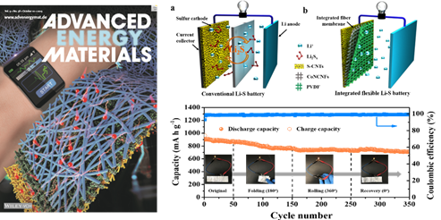 该研究工作以《“三位一体”集成化纤维膜助力柔性和高负载锂硫电池》(Flexible and High-Loading Lithium-Sulfur Batteries Enabled by Integrated Three-in-One Fibrous Membranes)为题,在环境能源领域顶级期刊《先进能源材料》(Advanced Energy Materials, IF=24.88)上发表,并被评为当期“内封面”(Inside Front Cover),西安交通大学王嘉楠博士为本论文的第一作者,西安交通大学为第一署名单位。