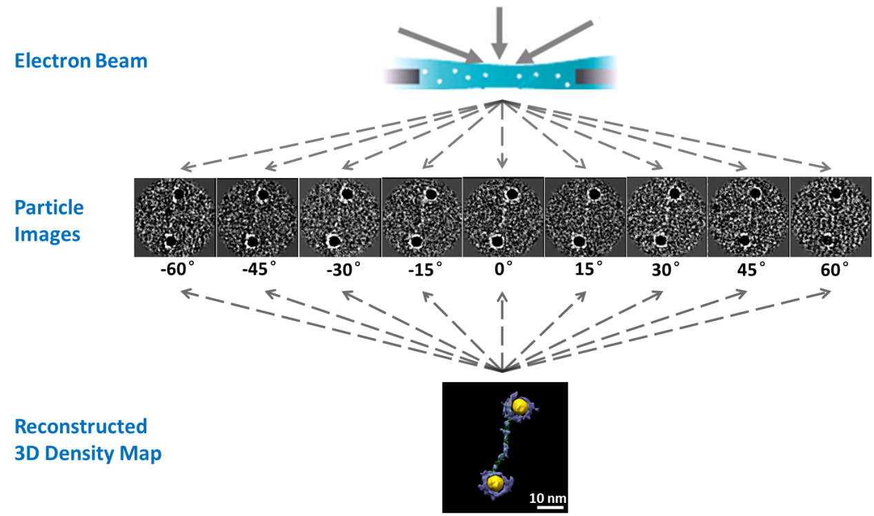 利用冷冻透射电镜技术,结合课题组开发的优化负染色技术和单分子电子断层成像(Individual-particle Electron Tomography,IPET)方法,此国际交叉联合科研组成功地得到了该DNA聚合物(含一个84碱基对的双螺旋DNA和两个5纳米的金颗粒)的高分辨冷冻电镜图像和负染色电子断层成像数据。基于这些数据,首次得到了14个此类聚合物的单分子电子密度图(分辨率约为1至2纳米);以这些电子密度图作为限制,利用分子动力学模拟手段,得到了14个双螺旋DNA的分子结构模型,并对其弹性模型进行了分析。结果表明,通过此方法得到的聚合物的形态统计分布和其它手段得到的结果一致,但是可以得到更多的结构信息,为进一步的机理分析提供了直接数据,对最终的复杂结构的设计、合成和验证提供了技术保障,也证明了课题组发展的单分子电子断层成像技术可以用于研究DNA复合物以及其他柔性蛋白质等有机大分子的动态结构。