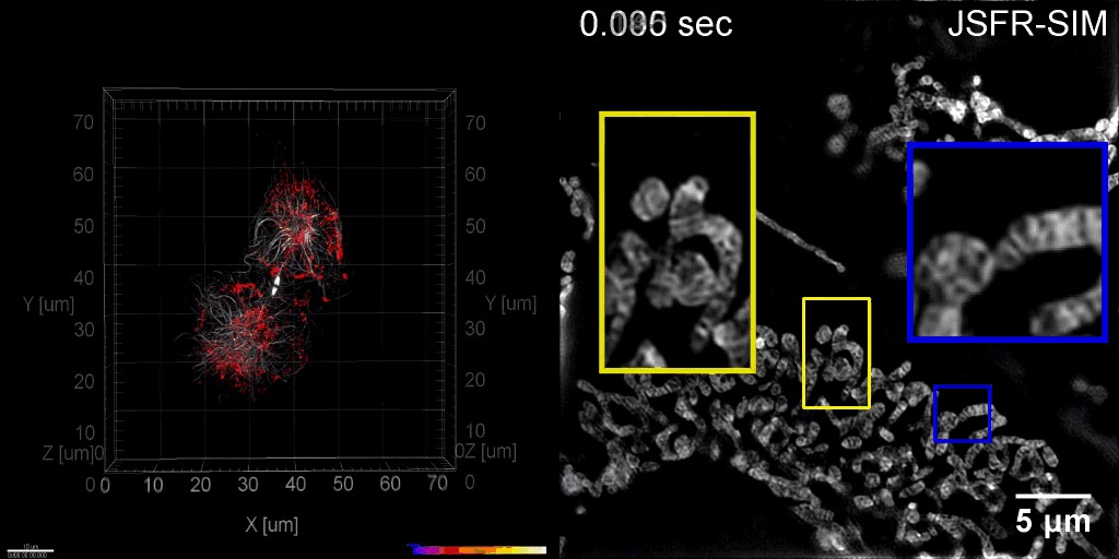 雷铭教授团队提出了一种空频域混合式重建算法(Joint Space and Frequency Reconstruction, JSFR-SIM),极大地提高了SR-SIM的图像重建速度,解决了传统重建方法难以实现实时重建的问题。同时,该算法还能够有效抑制活细胞成像时的背景荧光与周期性的计算伪影,为解析活细胞中细胞器的精细结构观测提供了极大的便利。经测试,该方法将SR-SIM的图像重建时间缩短到毫秒级别并实现了超分辨图像的实时显示,重建速度比目前广泛使用的Wiener-SIM算法快了近2个数量级。理论模拟和实验观测均证明该方法在提升重建速度的同时并不会损失任何图像质量。