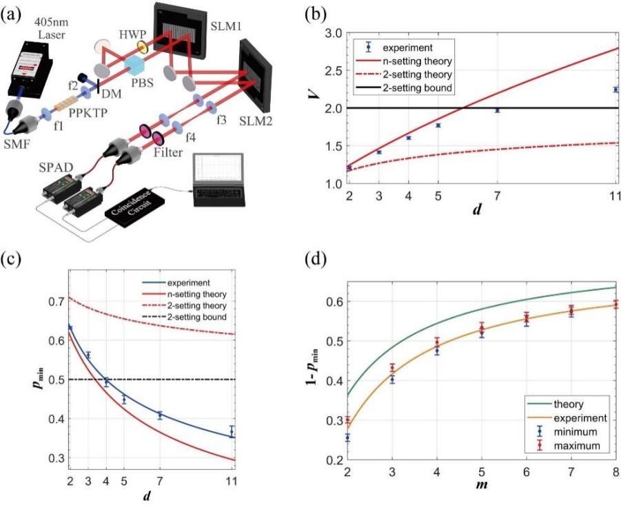 图(a)双光子高维导引实验装置图;(b)对导引不等式的违反程度;(c)不同维度的噪声阈值;(d)不同测量设置的噪声阈值