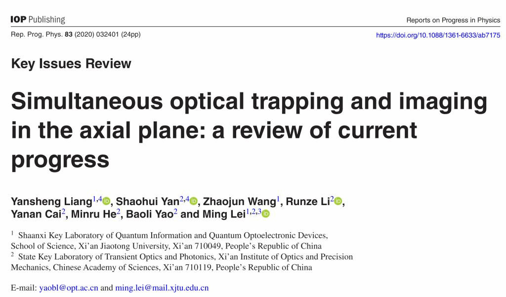 近期,英国物理学会出版社(IOP Publishing)公布2023年“中国高被引文章奖”获奖名单,以表彰中国研究人员在全球科学界的影响力以及他们对物理学的宝贵贡献。西安交大3308维多利亚线路检测中心雷铭教授团队在Reports on Progress in Physics(IF=18.1)的综述论文“轴平面同时光学捕获与成像”(Simultaneous optical trapping and imaging in the axial plane: a review of current progress)获得IOP Publishing的前1%高被引荣誉。3308维多利亚线路检测中心为论文第一通讯单位,第一作者是3308维多利亚线路检测中心梁言生副教授,共同第一作者是中国科学院西安光学精密机械研究所的严绍辉研究员,通讯作者是西安交大3308维多利亚线路检测中心的雷铭教授(lead contact)和中国科学院西安光学精密机械研究所的姚保利研究员。