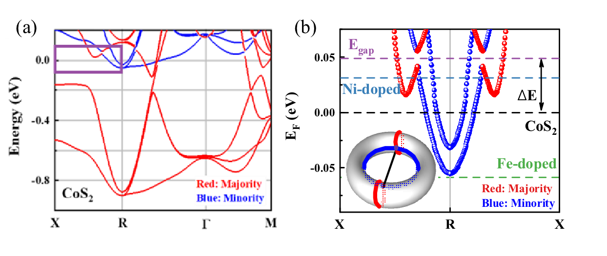 图1.(a) CoS2能带结构图。其中紫色矩形框内描绘了在费米面EF附近的交叉子带结构。(b)展示了亚子带交叉结构及子带能隙。掺杂电子(Ni掺杂,蓝色)和空穴(Fe掺杂,绿色)后费米面移动,其具体位置由第一性原理计算获得。