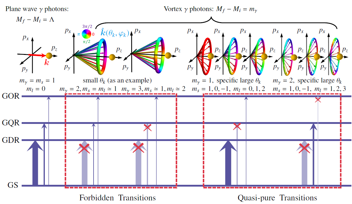 平面波或涡旋γ光子在光轴上激发偶偶核的示意图。禁戒跃迁表示具有多极性J <丨mγ丨的电磁跃迁被禁戒,其中mγ是γ光子总角动量在其传播方向上的投影。准纯跃迁表示电磁跃迁主要来自于多极性J =丨mγ丨的贡献。