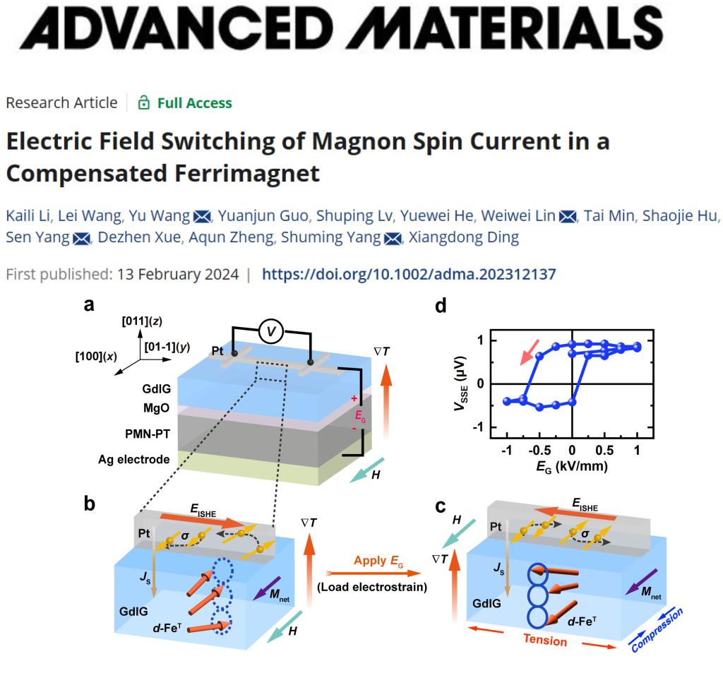 该研究工作以“Electric Field Switching of Magnon Spin Current in a Compensated Ferrimagnet”为题目发表在材料科学领域顶级期刊《先进材料》(Advanced Materials)上。该论文第一作者为西安交通大学博士生李凯丽和东南大学副教授王蕾,通讯作者为西安交通大学王宇教授、杨森教授、杨树明教授和东南大学林维维教授,3308维多利亚线路检测中心为本论文的第一单位。该研究获到了国家自然科学基金、国家重点研发计划、陕西省重点研发计划等项目的支持。